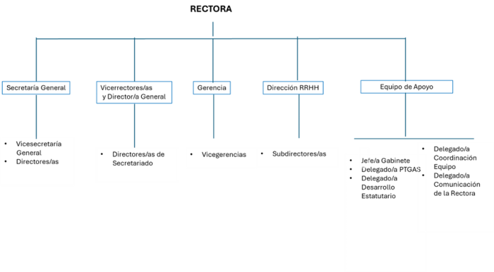 En la Resolución de la Rectora de la Universidad de Sevilla, por la que se desarrolla la estructura del Equipo de Gobierno, se determinan las competencias que se van a delegar en sus titulares y se especifican los servicios y unidades administrativas que se la van a adscribir (CG 21 enero 2026), informando al CG de que la estructura va a ser la mostrada en el siguiente organigrama: